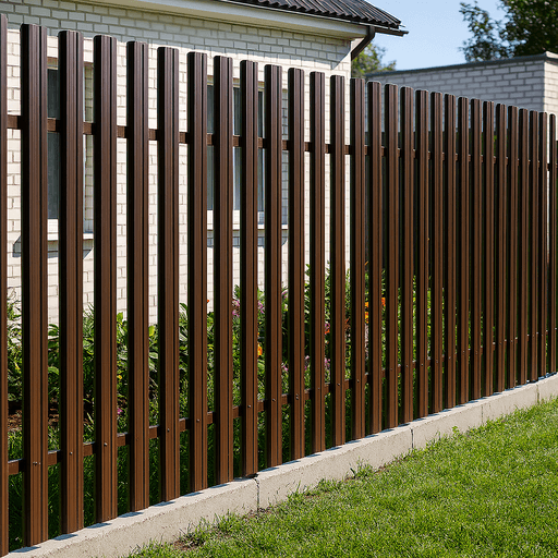 Забор из металлического штакетника — это надежное и эстетичное ограждение, подходящее как для частных домов, так и для промышленных объектов. Конструкция представляет собой набор вертикальных металлических ламелей, закрепленных на поперечные лаги, установленные на столбы.